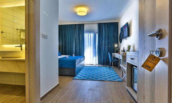 Suite: spalnica (zakonska postelja ali dve ločeni ležišči), dnevni prostor, klima, kopalnica (prha, WC, sušilec za lase), TV, sef, brezplačen WiFi, mini hladilnik, grelnik za vodo, balkon ali terasa.