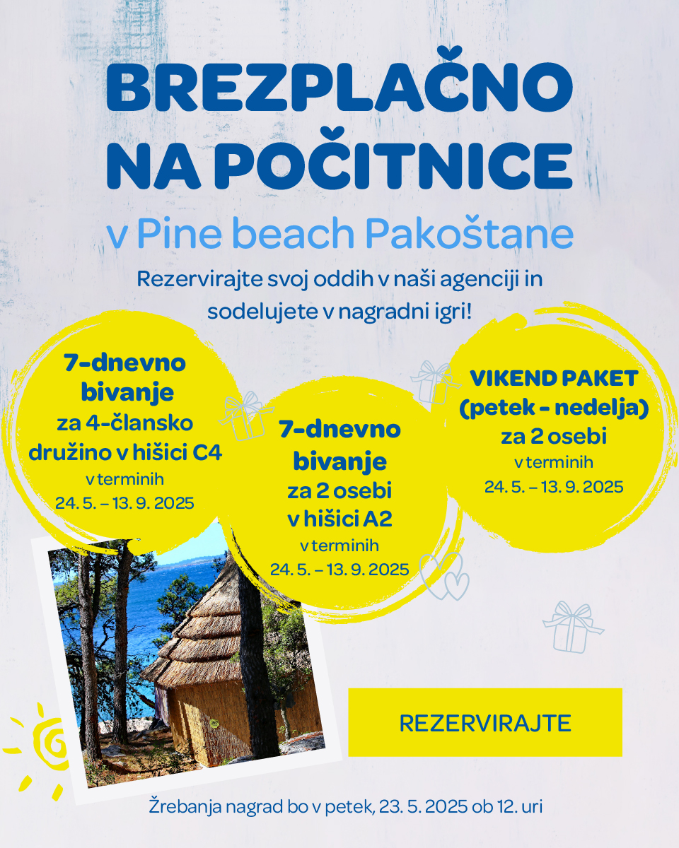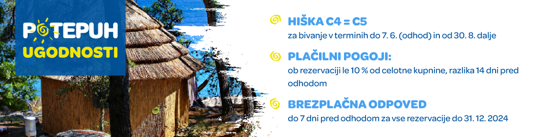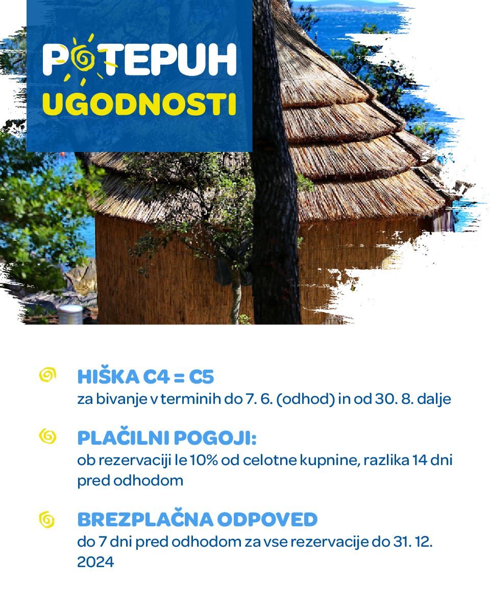 - slamnate hiške: namestitev v izbrani hiški, samopostrežni zajtrk, kosilo in večerja, popoldanski prigrizki, pijača ob obrokih (točeno pivo, namizno vino, voda, brezalkoholne pijače iz šankomata), športne aktivnosti (jadranje, najem kajaka, jadranje na deski, tenis, namizni tenis, košarka, nogomet, odbojka na mivki, aerobika, vodna aerobika, vaterpolo, badminton, lokostrelstvo, mini fitnes na prostem, mini golf, adrenalinski park), dnevna in večerna animacija za odrasle in otroke, ležalniki na plaži (do zasedenosti kapacitet), zunanje parkirišče, brezplačen WiFi, turistična taksa.