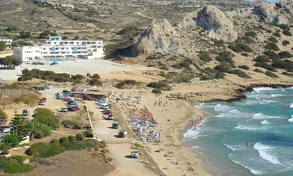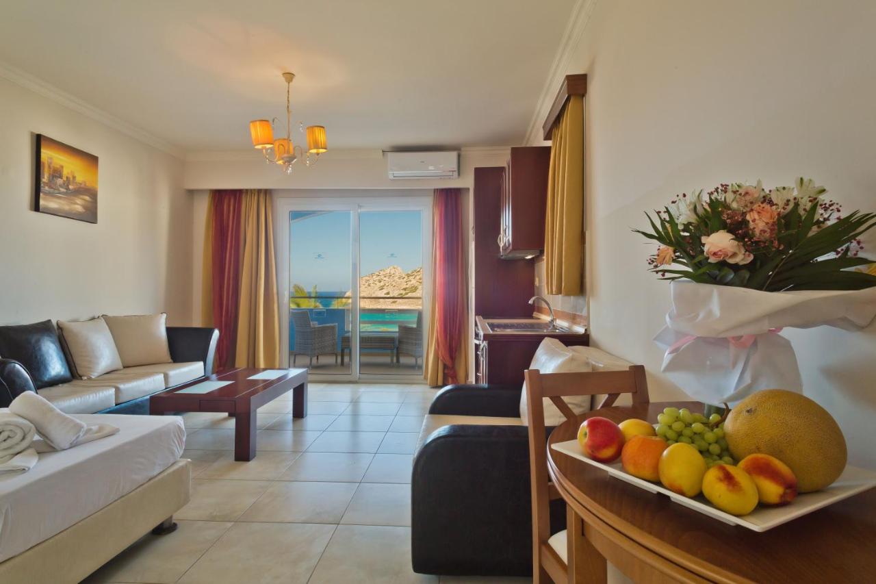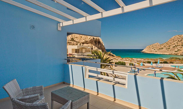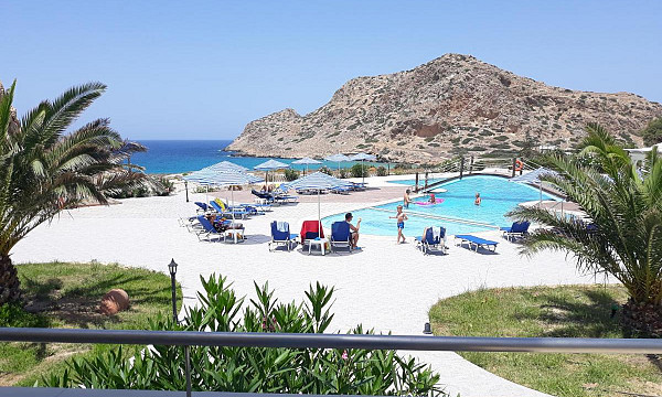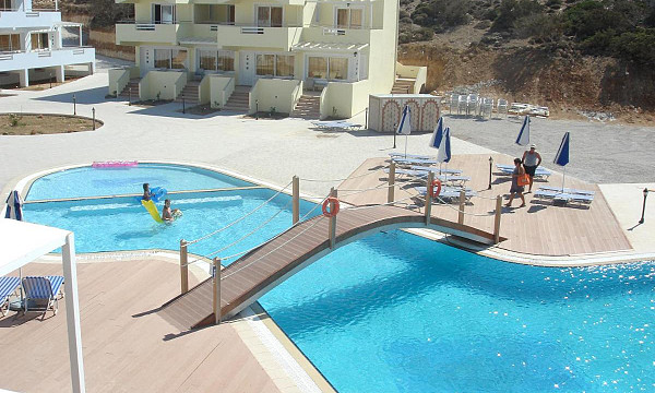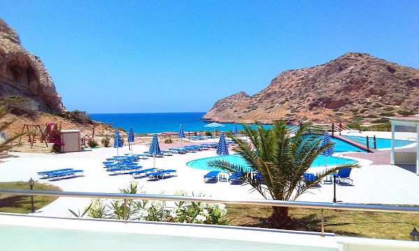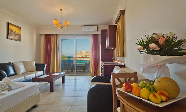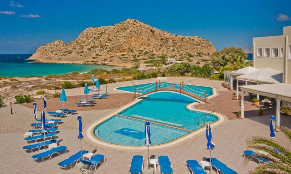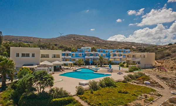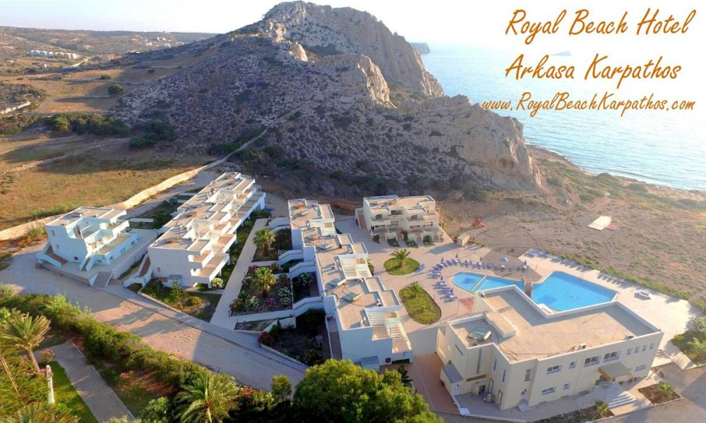 ob peščeno-prodnati plaži Agios Nikolaos, pribl. 500 m od središča mesta Arkasa, 16 km od Pigadie in 11 km od letališča.