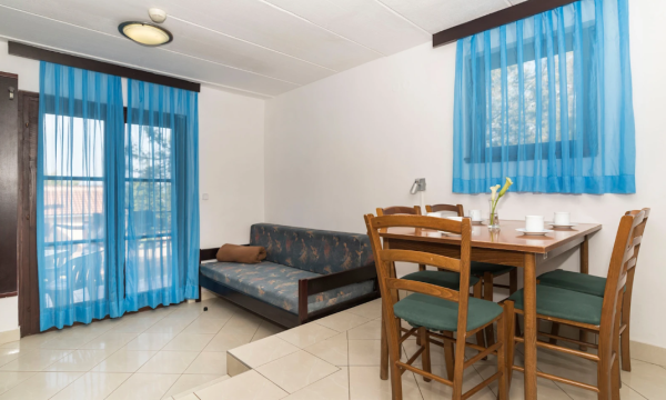 APP 4+1 (pribl. 46 m2): dve spalnici, dnevni prostor z dvema kavčema, jedilni kot, kuhinjska niša, kopalnica (kad, WC), SAT TV, telefon, WiFi (doplačilo), balkon ali terasa.