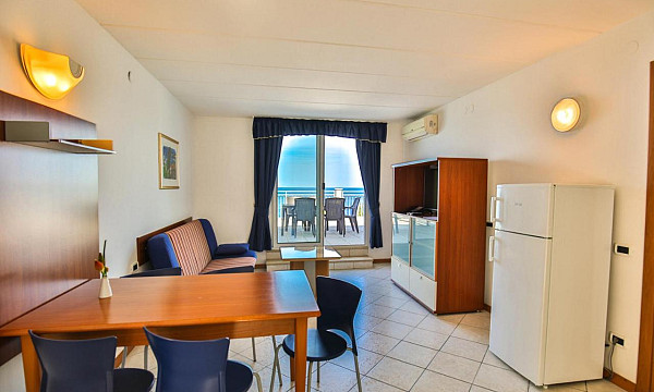 APP 1/3+2 M (pribl. 40-55 m2): kuhinja (aparat za filter kavo, hladilnik z zamrzovalnikom), dnevni prostor z raztegljivim kavčem (2 ležišči), spalnica z zakonsko posteljo in dodatnim ležiščem, kopalnica (prha, WC, sušilec za lase), klima, SAT TV, sef, telefon, balkon s sedežno garnituro na morsko stran.