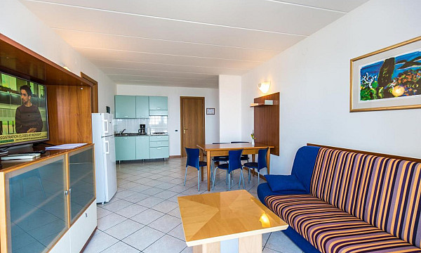 APP 1/3+2 (pribl. 40-55 m2): kuhinja (aparat za filter kavo, hladilnik z zamrzovalnikom), dnevni prostor z raztegljivim kavčem (2 ležišči), spalnica z zakonsko posteljo in dodatnim ležiščem, kopalnica (prha, WC, sušilec za lase), klima, SAT TV, sef, telefon, balkon s sedežno garnituro.