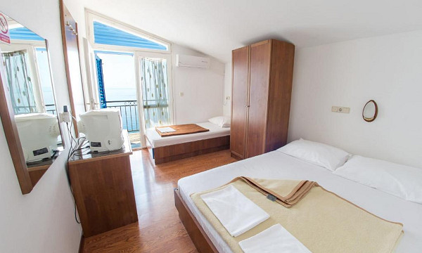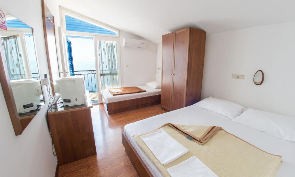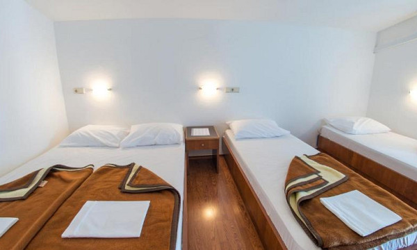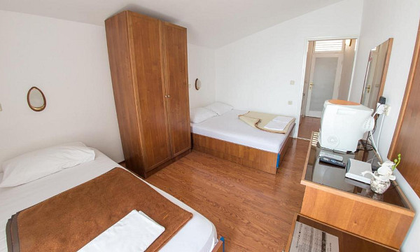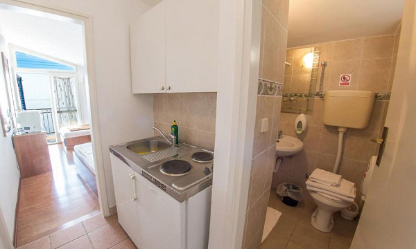 1/2+1 BM (22 m2): zakonska postelja, enoposteljno ležišče, klima, zasebna kopalnica (prha, WC, sušilec za lase), kuhinja, kuhinjska posoda, SAT TV, WiFi (brezplačno), balkon na morsko stran.