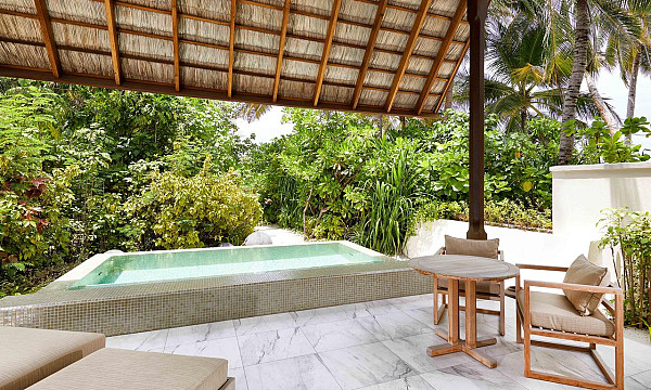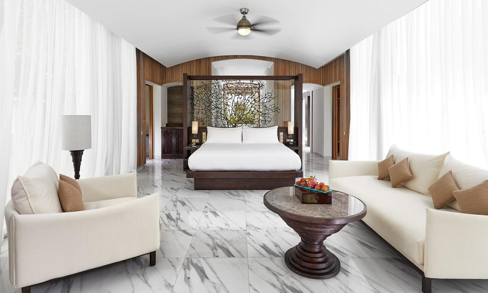 Vila na plaži Deluxe (pribl. 300 m2): dnevno-spalni prostor z zakonsko posteljo, klima, stropni ventilator, kopalnica (prha, WC, sušilec za lase, kopalni plašči, copati), TV, DVD predvajalnik, telefon, WiFi, sef, mini bar, grelnik za vodo, aparat za pripravo kave in čaja, terasa z bazenom in pogledom na morje.