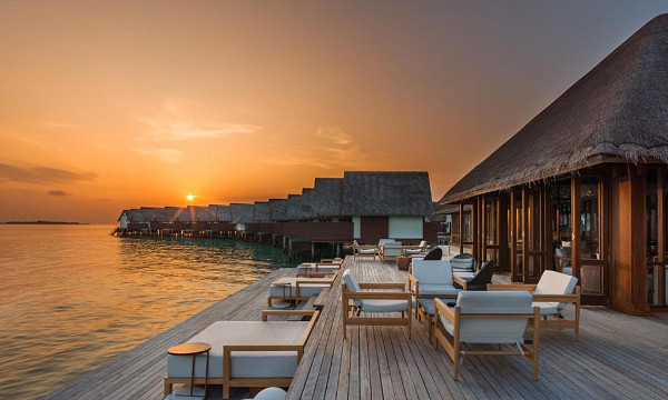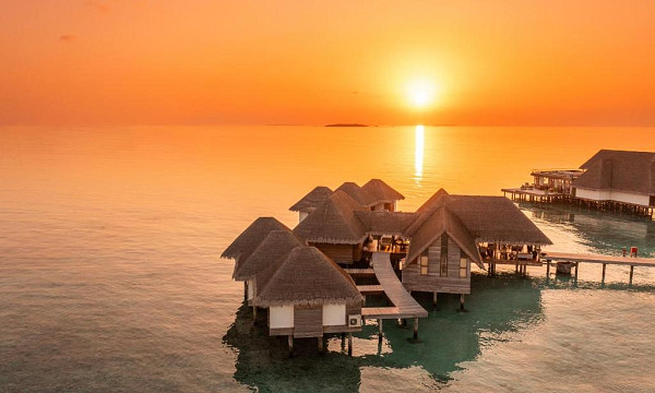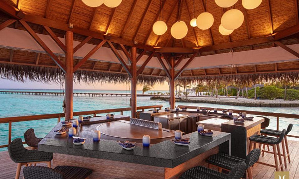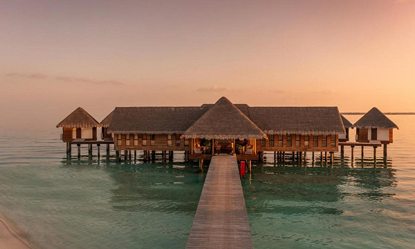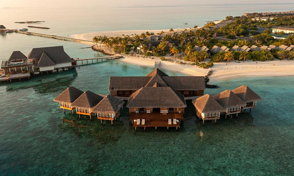 - Vila na vodi (91 m2): nahajajo se nad lesketajočo se laguno in gledajo na neskončno obzorje. Vse vile nad vodo se ponašajo s steklenim dnom ob vznožju postelje, kar vam omogoča uživanje v bogatem podvodnem svetu kar iz udobja vaše vile. Zasebna zunanja terasa vam nudi romantično okolje, kjer se lahko zleknete ob sončnem zahodu ali pa se potopite v vodo pod njim. Klimtizirane vile vključujejo kombiniran skupni prostor z eno veliko zakonsko posteljo (200x200cm), kopalnica, tuš, kopalna kad, WC, kopalni plašč, copati, sušilec za lase, mini bar, sef, telefon, TV, WiFi, Marshall Bluetooth zvočnik, kavč, pisalna miza, Nespresso kavomat, grelnik vode za pripravo kave/čaja, butler postrežba, otroška posteljica (na zahtevo), opremljena terasa in direkten dostop do morja.