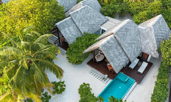 - Vila na plaži (92 m2): neposreden dostop do sonca, peska in morja z veliko verando na prostem za uživanje v tropskih počitnicah in čarobnem morskem ambientu. Klimatizirane vile vključujejo kombiniran skupni prostor z eno veliko zakonsko posteljo (200x200cm), kopalnica, delno zunanji tuš, prostostoječa kopalna kad, WC, kopalni plašč, copati, sušilec za lase, mini bar, sef, telefon, TV, WiFi, Marshall Bluetooth zvočnik, kavč, pisalna miza, Nespresso kavomat, grelnik vode za pripravo kave/čaja, otroška posteljica (na zahtevo), Butler postrežba, opremljena terasa z ležalniki in neposrednim dostopom do plaže.