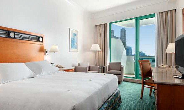 1/2 Deluxe Walk (dvoposteljna soba, 38 m2): možnost dodatnega ležišča, kopalnica (kad, tuš, WC), balkon, klimatska naprava, pogled na promenado.