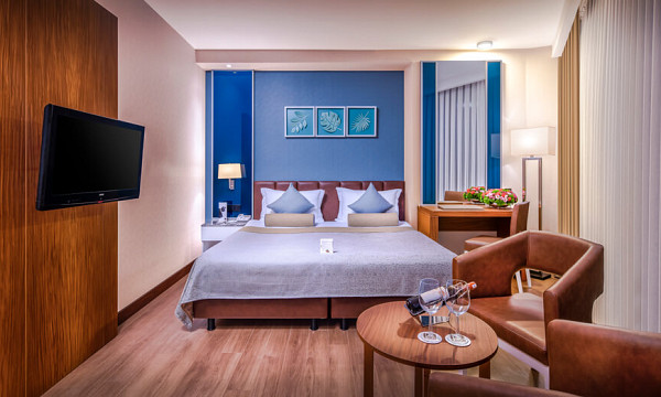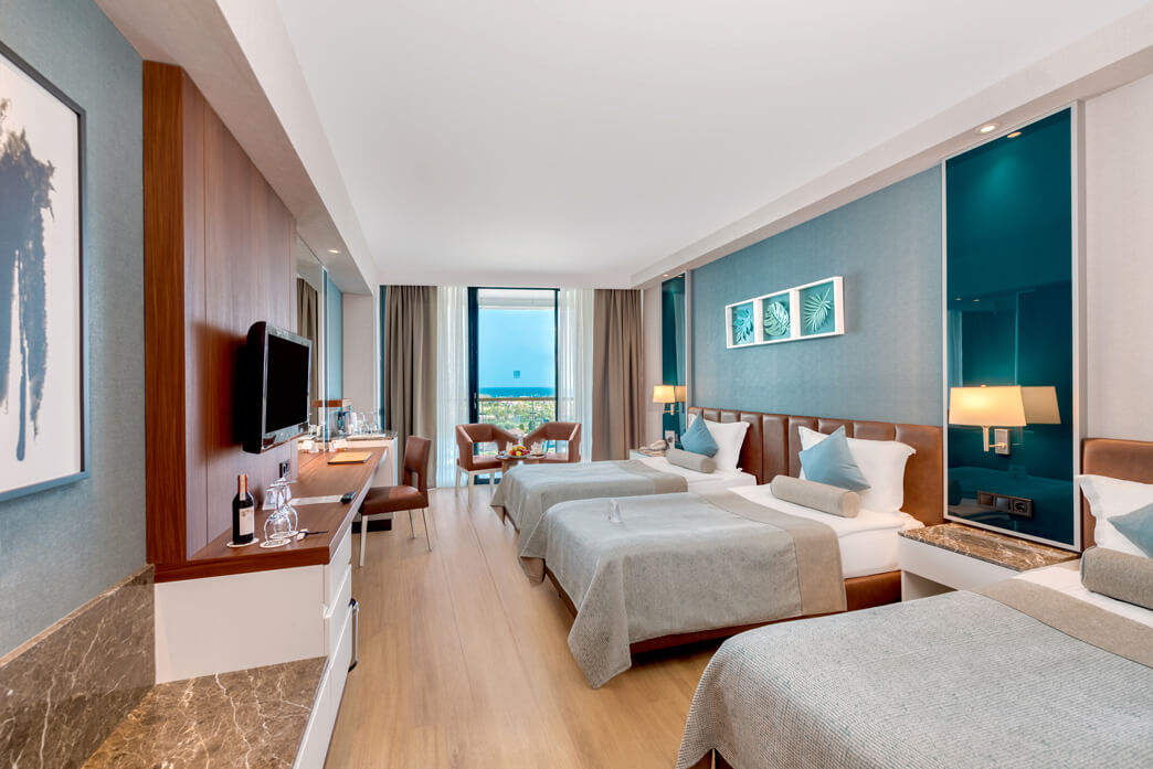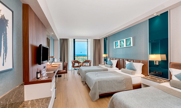 Družinske sobe: spalnica in dnevno-spalni prostor z raztegljivim kavčem, klima, kopalnica (prha/kad, WC, sušilec za lase), SAT TV, WiFi, telefon, sef, mini bar (dnevno polnjenje), aparat za čaj in kavo, balkon. Možnost rezervacije sobe s stranskim ali neposrednim pogledom na morje.