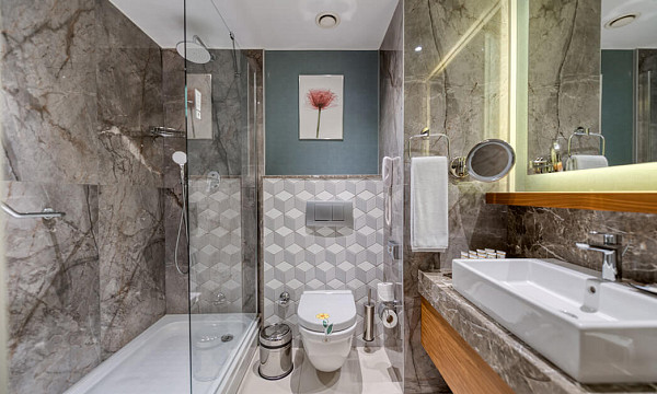 Dvoposteljne sobe: zakonska postelja ali dve ločeni ležišči, klima, kopalnica (prha/kad, WC, sušilec za lase), SAT TV, WiFi, telefon, sef, mini bar (dnevno polnjenje), aparat za čaj in kavo, francoski balkon. Možnost rezervacije sobe s stranskim ali neposrednim pogledom na morje.