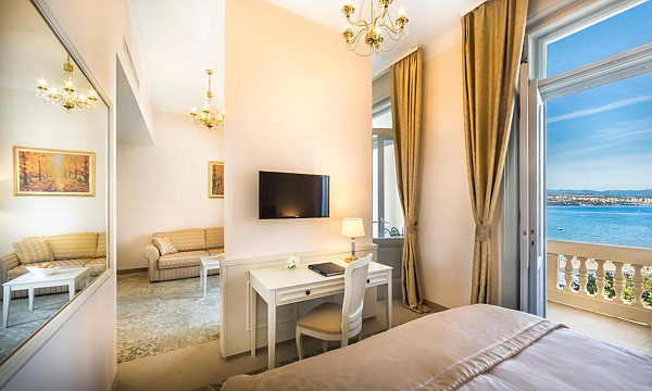 1/2 BM SUPERIOR (18 m2): zakonska postelja ali dve ločeni ležišči, klima, kopalnica (prha/kad, WC, sušilec za lase), SAT TV, sef, WiFi, mini bar, balkon na morsko stran.