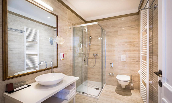1/2 SUPERIOR – ULICA (16 m2): zakonska postelja ali dve ločeni ležišči, klima, kopalnica (prha/kad, WC, sušilec za lase), SAT TV, sef, WiFi, mini bar. Soba nima balkona in je obrnjena na ulico.