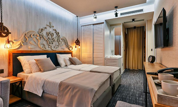 Dvoposteljne sobe: zakonska postelja ali dve ločeni ležišči, klima, kopalnica (prha, WC, sušilec za lase), TV, sef, brezplačen WiFi, mini bar in balkon.