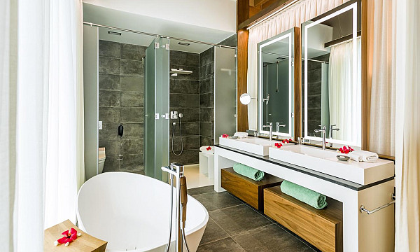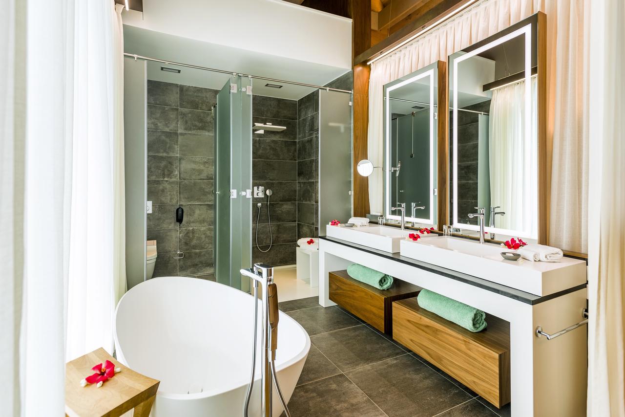Vila na vodi z bazenom (pribl. 65 m2 bivalne površine in 75 m2 terase): dnevno-spalni prostor s steklenim dnom, garderobna omara, klima, stropni ventilator, kopalnica (prha, WC, sušilec za lase, kopalni plašči), TV, DVD predvajalnik, iPod postaja, WiFi, mini bar, aparat za pripravo kave in čaja, terasa z bazenom, zunanjo prho, pogledom na plažo in neposrednim dostopom do morja.