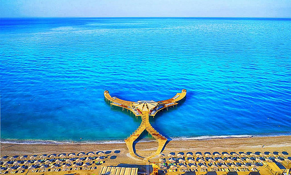 hotelska, počasi padajoča peščeno-prodnata plaža, pomol.