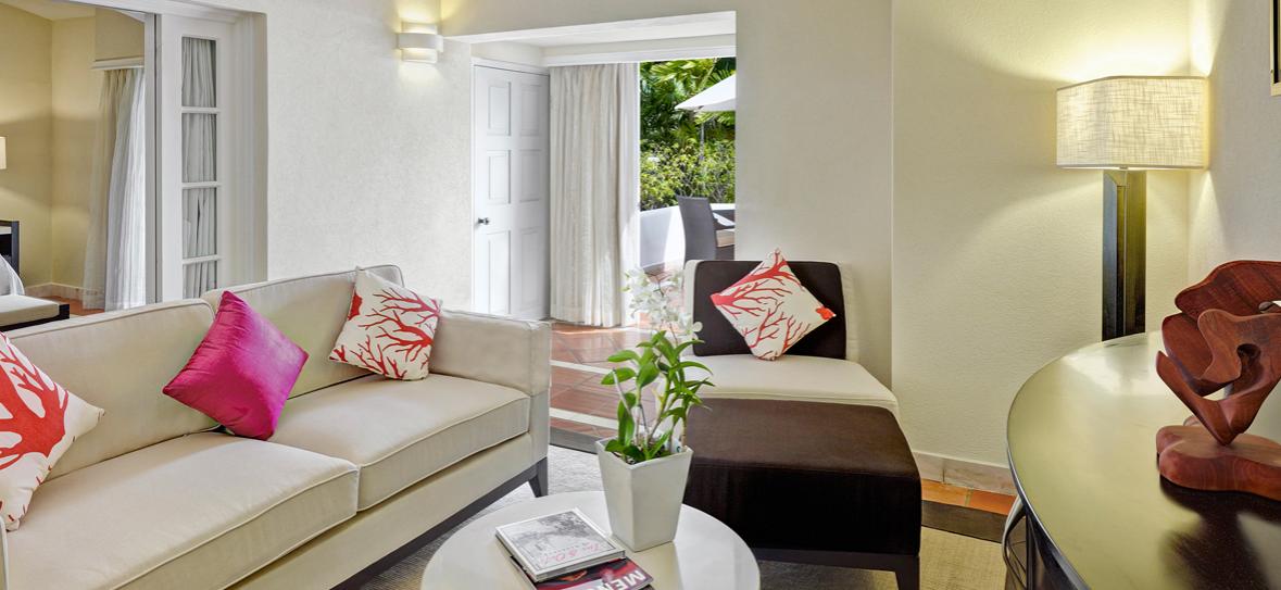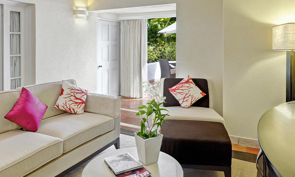 Garden View One Bedroom suite: ločen dnevni prostor, spalnica z balkonom, zasebni jacuzzi ali bazen, pogled na vrt.