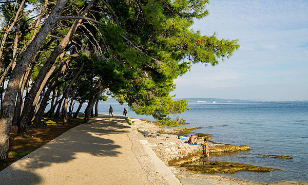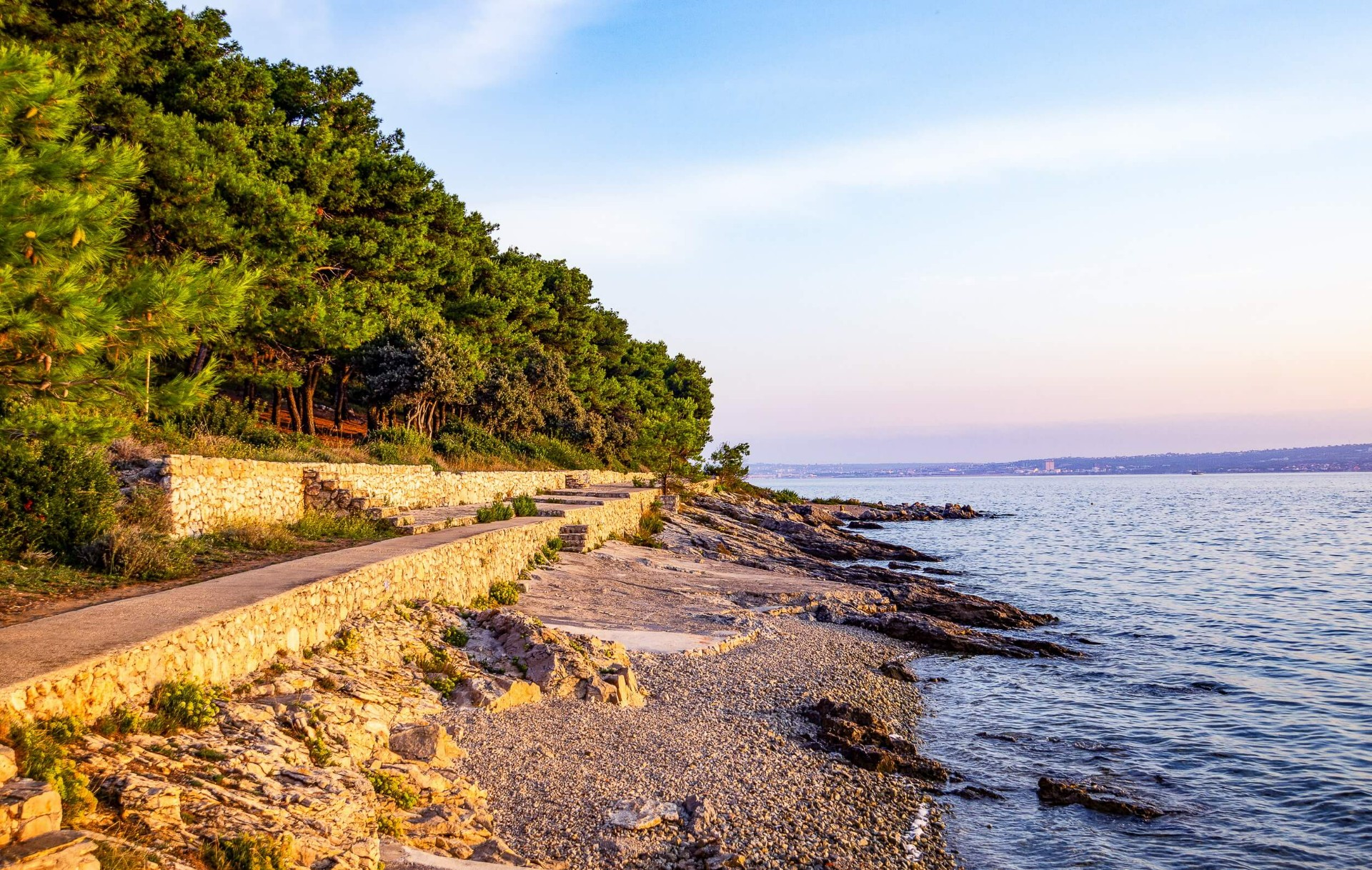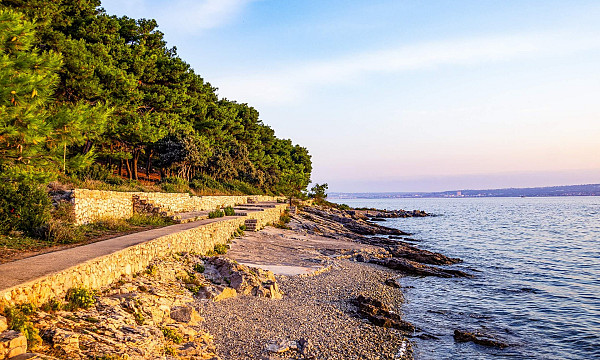 betonska, skalnata in mestoma prodnata plaža je oddaljena pribl. 80-150 m. V bližini so znane peščene plaže Kostanj, Jelenica in Sabuša.