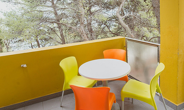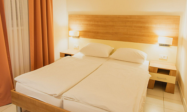 APP 1/4+2 TIP C – prenovljeni (pribl. 55-60 m2): dve spalnici, dnevni prostor z raztegljivim kavčem za eno osebo in kuhinjsko nišo, klima, kopalnica (prha, WC, sušilec za lase), SAT TV, sef, brezplačen WiFi, terasa ali balkon s sedežno garnituro. Namestitev največ 5 odraslih in 1 otrok do 12 let. Oddaljenost od morja: pribl. 150 m. Apartmaji so bili l. 2023 prenovljeni.