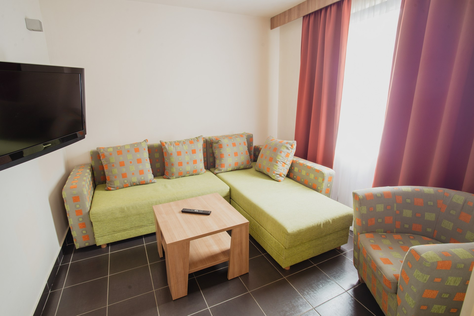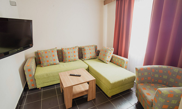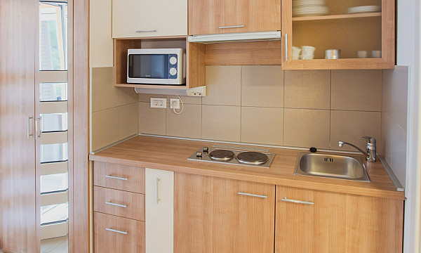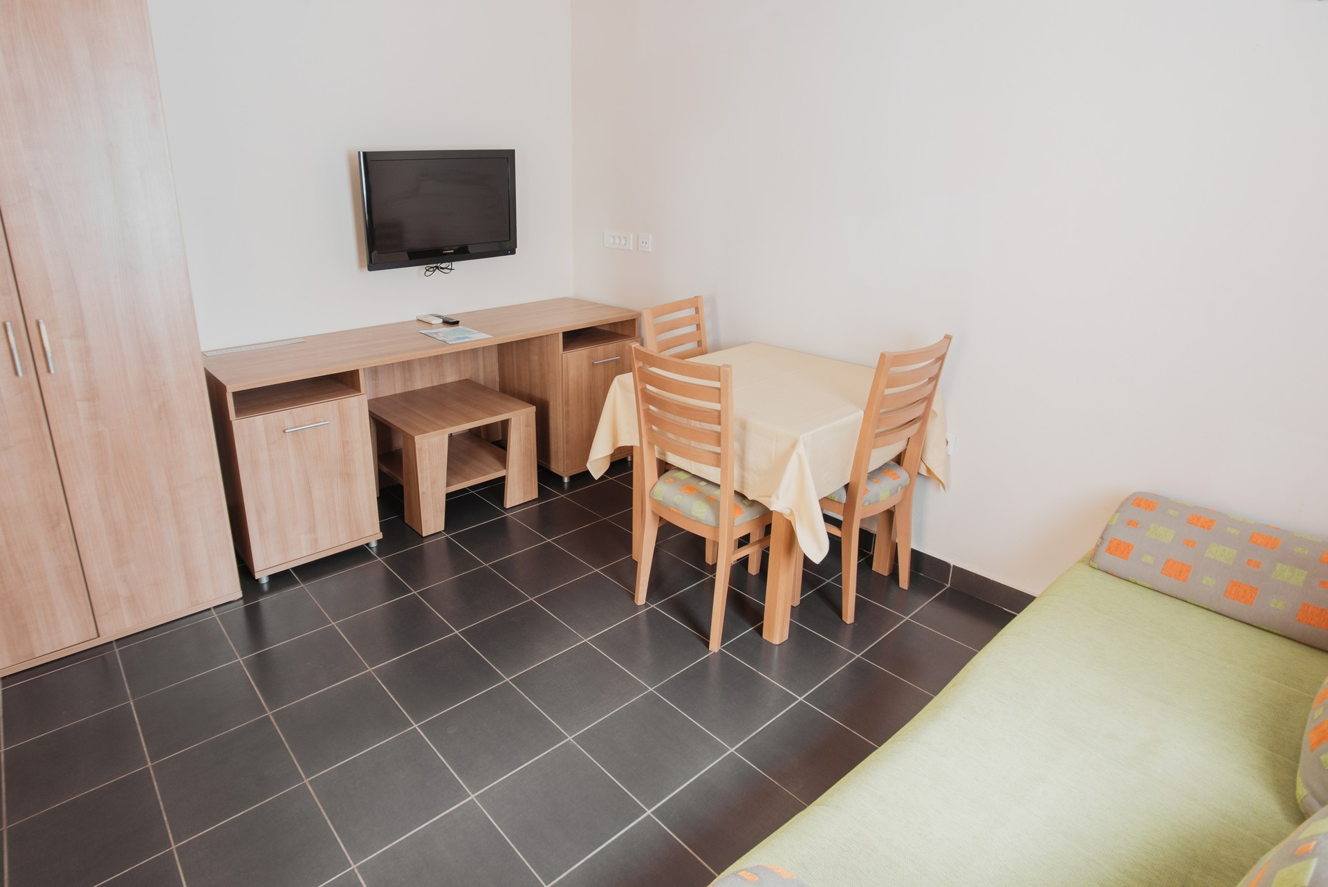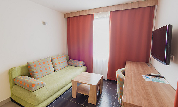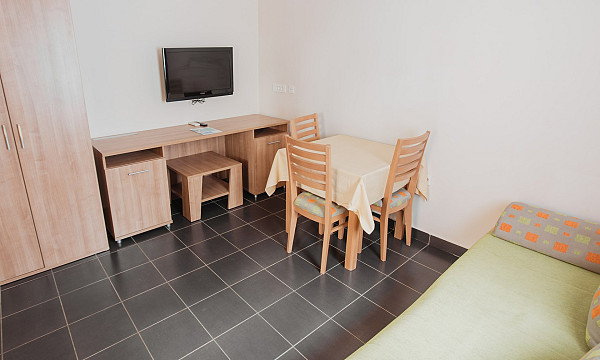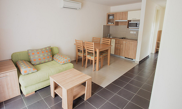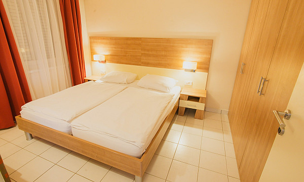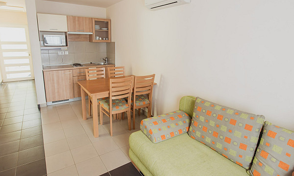 APP 1/2+2 TIP A: spalnica (zakonska postelja), dnevni prostor z raztegljivim kavčem za eno osebo in kuhinjsko nišo, klima, kopalnica (prha, WC, sušilec za lase), SAT TV, sef, brezplačen WiFi, terasa ali balkon s sedežno garnituro. Namestitev največ dva odrasla in dva otroka do 12 let. Oddaljenost od morja: pribl. 150 m.